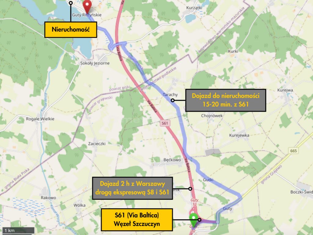 Plan dopuszcza wybudowanie nowych budynków o łącznej powierzchni zabudowy do 1000 m2 spełniających następujące kryteria:maksymalna liczba miejsc noclegowych - do 100 miejscmaksymalna wysokość budynków - 9 mmaksymalna liczba kondygnacji nadziemnych - 3, w tym poddasze użytkowepoziom parteru nie wyżej niż 1 metr ponad istniejącym poziomem terenuSzybki dojazd z Warszawy drogą ekspresową S8 i dalej S61 do zjazdu Szczuczyn (2 godz. jazdy z Warszawy, ok. 200 km) i dalej zaledwie 15-20 minut do nieruchomości.